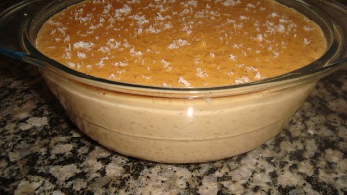 - Coloque o arroz doce ainda quente em um refratário, polvilhe canela em pó e coco ralado.