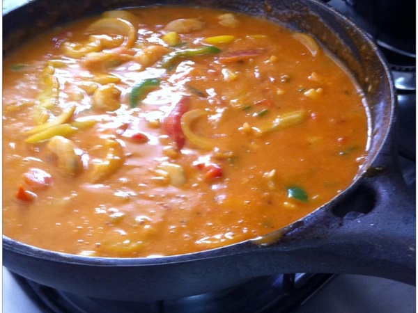 - Adicione as 2 latas de pomarola, o cheiro-verde, o pimentão e deixe cozinhar por alguns minutos