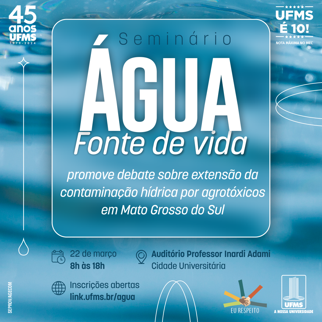 A contaminação por agrotóxicos em Mato Grosso do Sul é tema do seminário Água: Fonte de Vida, realizado na sexta-feira, 22, na Cidade Universitária. O encontro organizado pela UFMS, em parceria com a Superintendência-Geral de Atenção à Saúde do Estado e a Superintendência do Instituto Brasileiro do Meio-Ambiente e dos Recursos Naturais Renováveis, é aberto ao […]