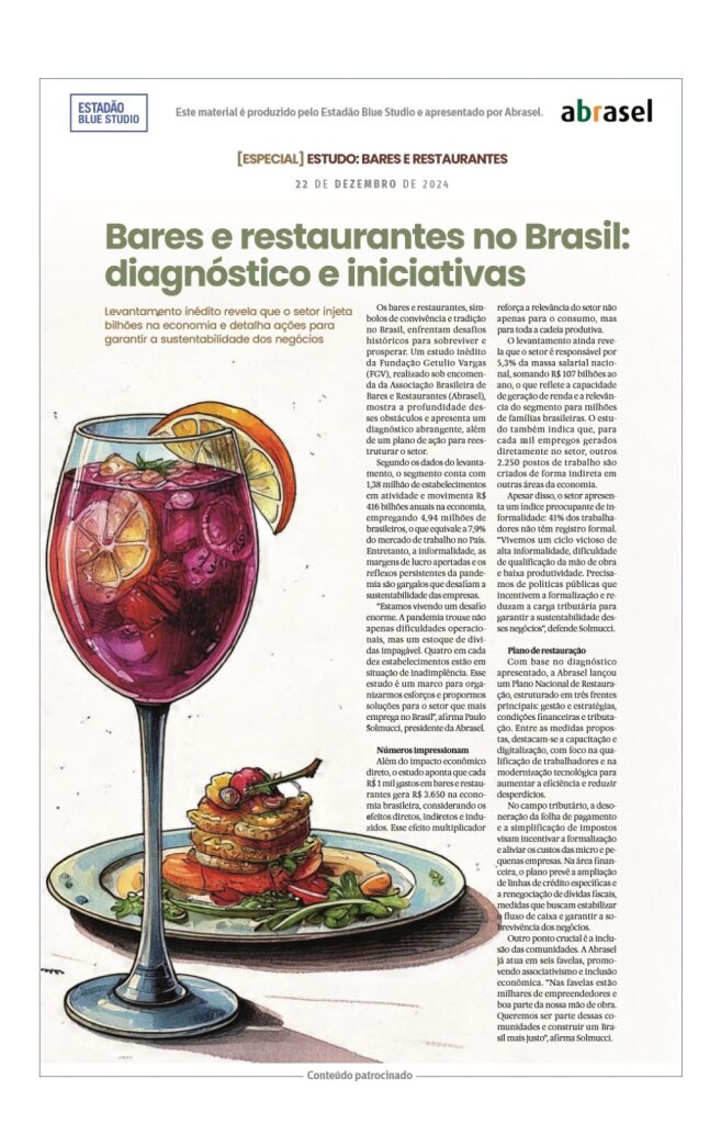O Jornal Estado de S. Paulo publicou, nO domingo (22), um caderno especial sobre o estudo realizado pela Fundação Getúlio Vargas (FGV) em parceria com a Abrasel, com um diagnóstico inédito do setor de alimentação fora do lar. O documento traz ainda o Plano de Restauração proposto pela entidade, com ações estratégicas que englobam transformações […]