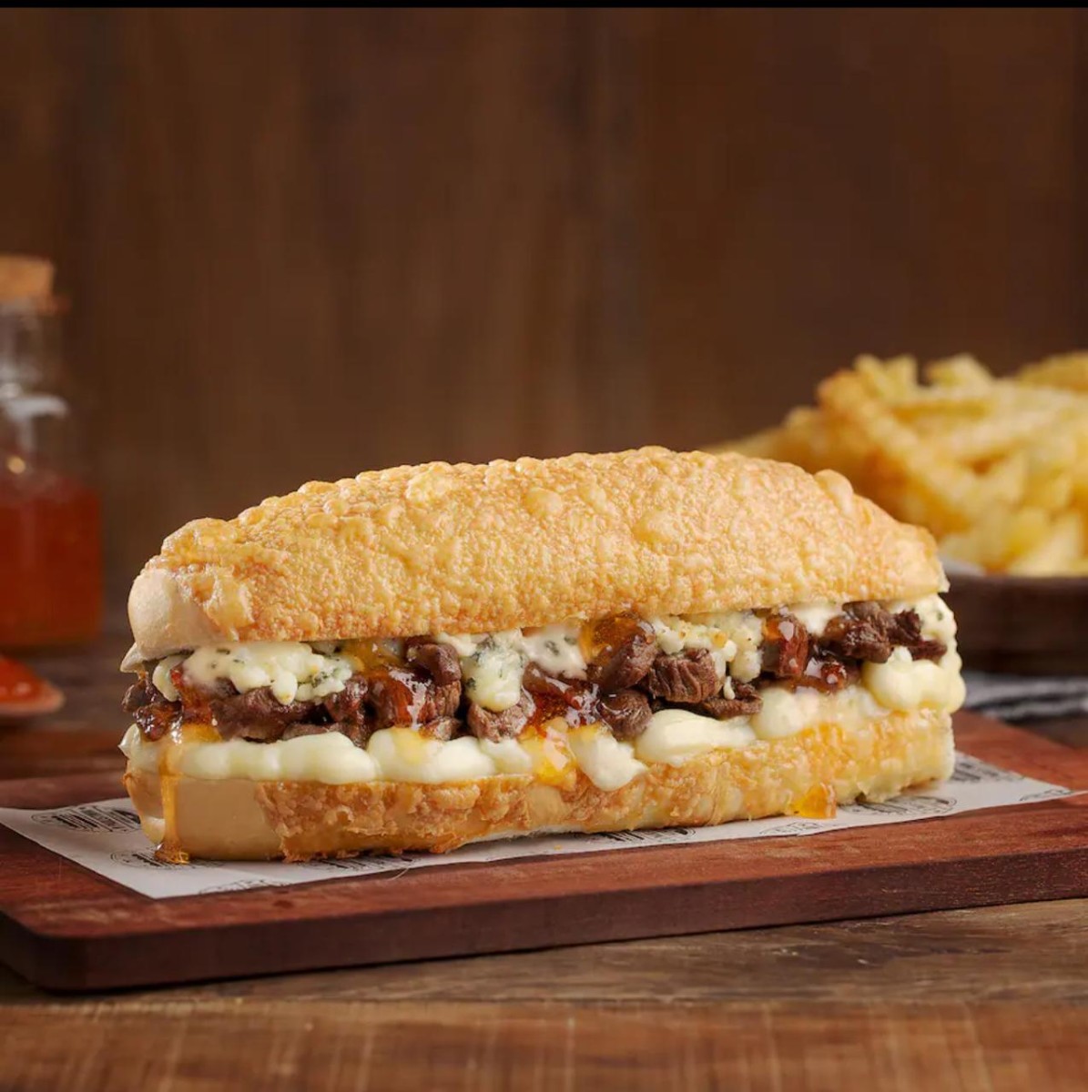 Essa maravilha vem com fraldinha em tiras, coberto com queijo gorgonzola derretido, geleia de pimenta e à base de cream cheese, servido no nosso pão baguete especial! Shopping Campo Grande 10:00 as 22:00, todos os dias 67 998226548
