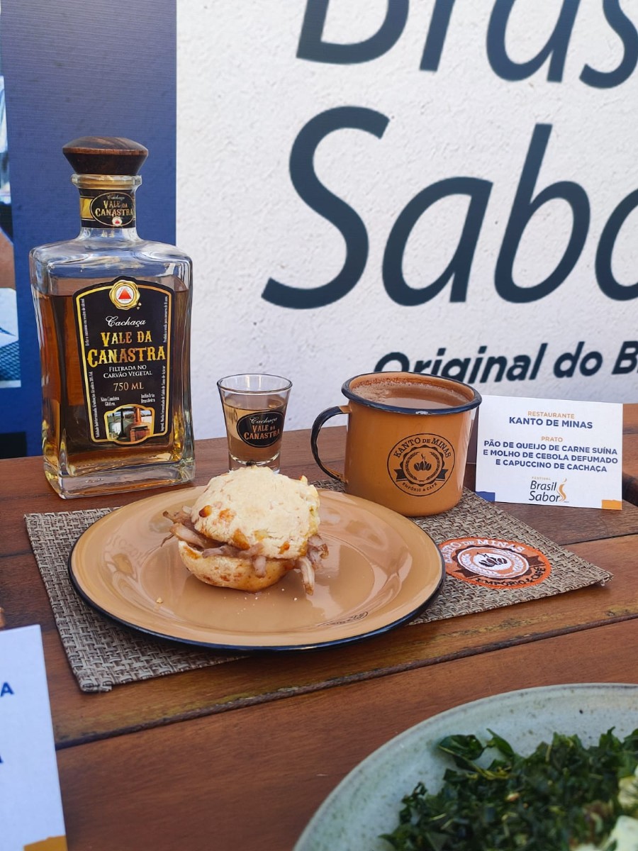 Pão de queijo com pernil suíno e molho de cebola agridoce. Capuccino com cachaça Vale da canastra. Rua Desembargador Eurindo Neves, 66 Das 08:00 às 22:00 h, de segunda a sábado. 67 999818080
