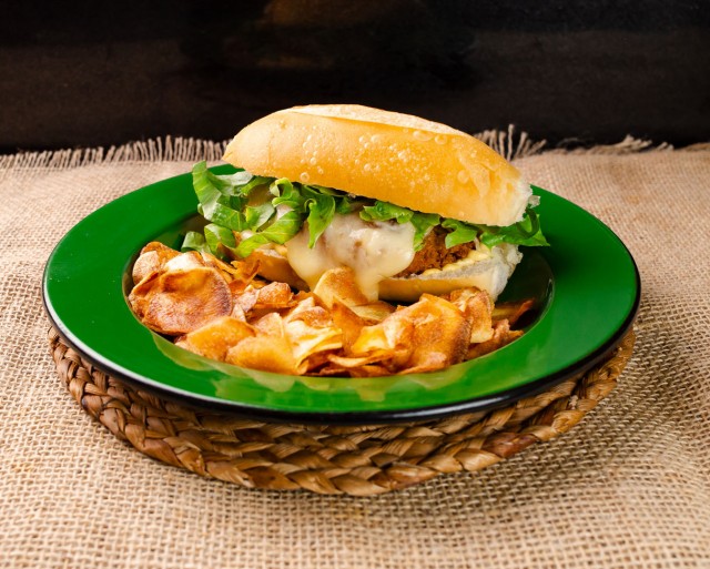 Delicioso e fresquinho pão francês, com hambúrguer de carne seca empanado na farinha panko e castanha de Baru, queijo mussarela, alface americana, tomate em rodelas, cebola roxa e maionese de banana da terra. PADOCA DO ENALDO R. Dom Aquino, 2158. AmambaI. Campo Grande-MS Telefone: (67) 98127-0175 @PADOCADOENALDO