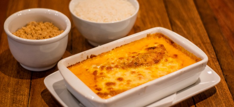 Arroz, farofa com bacon, pintado empanado coberto com molho de urucum e parmesão. TERROIR BRASILEIRO R. Vitório Zeola, 735. Carandá Bosque. Campo Grande-MS Telefone: (67) 4042-1927 @TBBRASILEIRO