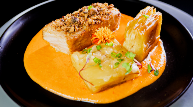 Com crosta de baru ao molho cremoso de urucum, mil folhas de mandioca. LES AMIS Rua José Antônio, 644. Centro. Campo Grande-MS Telefone: 67 3026 6444 Celular: @lesamisbistro @LESAMISBISTRO