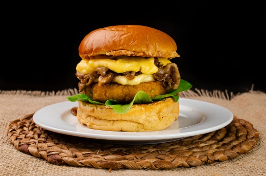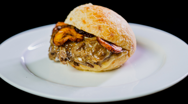Pão brioche selado na manteiga, proteína de shimeji, queijo vegetal, vinagrete de coentro e rúcula. LAS VEGG COMIDA VEGANA Rua13 De Junho, 641Loja 16. Centro. Campo Grande-MS Telefone: 67 99201 0708 @LASVEGGCG