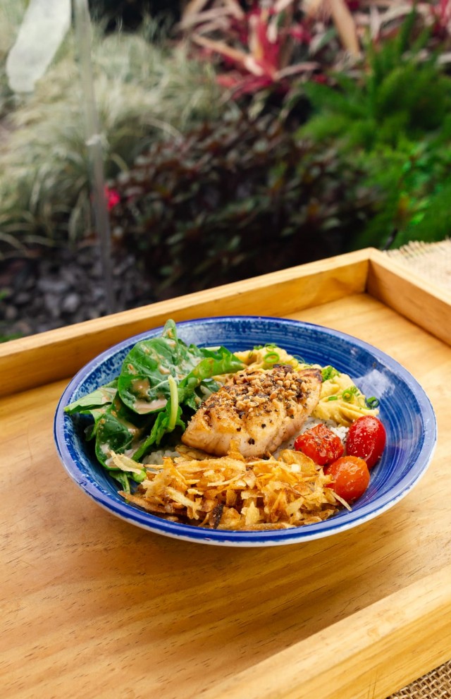 Arroz Gohan, filé de pintado, purê de banana da terra, chips de mandioca, tomate confit, rúcula, farofa de castanha de baru, finalizado com o molho do chef . CHEZ REJALA Rua Paraíba , 574. . Campo Grande-MS Telefone: (67) 99929 36540 @CHEZREJALA