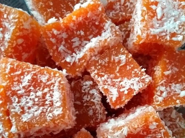 - Tire do fogo e deixe esfriar, depois retire os cubos de caldo, deixe escorrer e passe os cubos no coco ralado