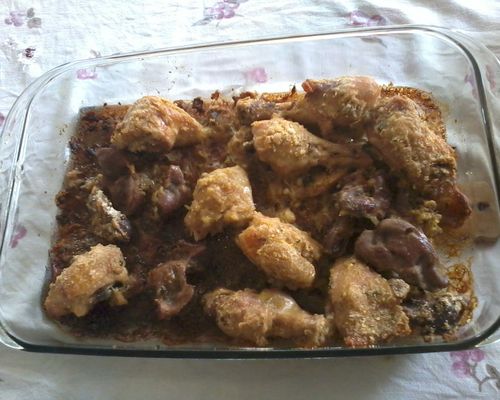 - Em cima de cada pedaço de frango, coloque um pouco de margarina, adicione um pouquinho de água e cubra com papel alumínio e coloque no forno para assar por 20 minutos.