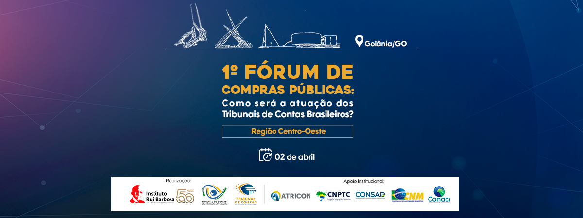 O 1º Fórum de Compras Públicas é uma realização do IRB, TCE-GO e TCMGO, com apoio institucional da Associação dos Membros dos Tribunais de Contas do Brasil (Atricon), Conselho Nacional dos Presidentes dos Tribunais de Contas (CNPTC), Associação Brasileira dos Tribunais de Contas dos Municípios (Abracom), Conselho Nacional de Controle Interno (Conaci), TCU, TC-DF, TCE-MT e TCE-MS. Essa é a primeira edição do evento, que também contemplará as regiões Norte, Nordeste, Sul e Sudeste do Brasil.