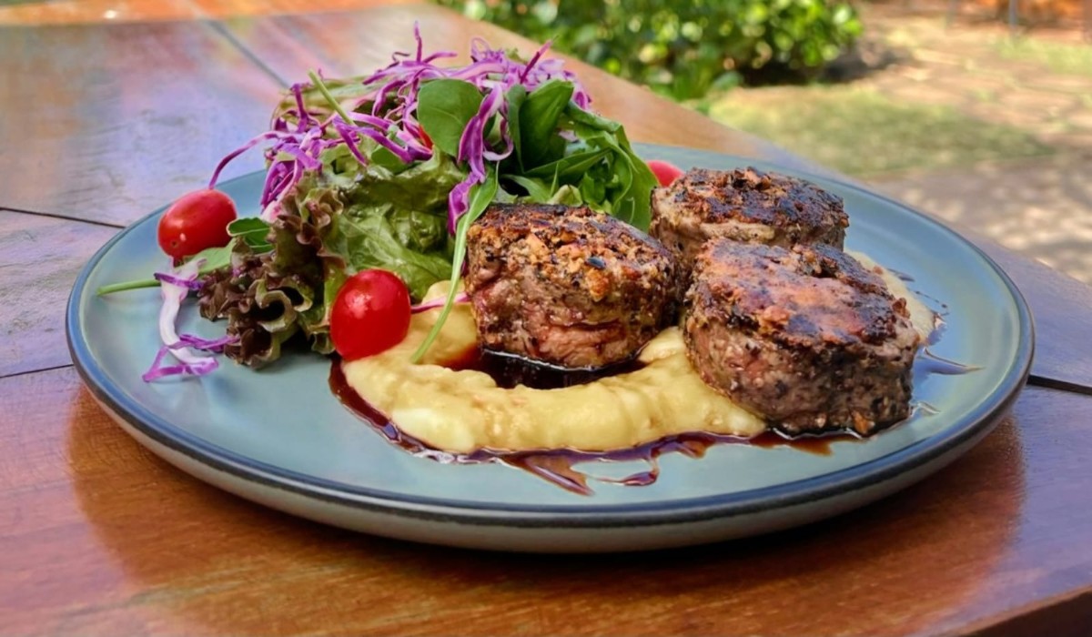 Medalhão de Filet Mignon com crosta de castanha de baru e redução de vinho tinto com rapadura de furnas, acompanhado de purê de batata rústica com queijo nicola.