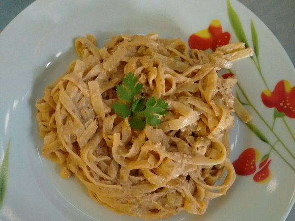 - Em uma panela grande despeje o óleo e refogue a cebola, a sardinha amassada e coloque junto os outros ingredientes, por último coloque o creme de leite, misture até ficar uma cor meio rosada