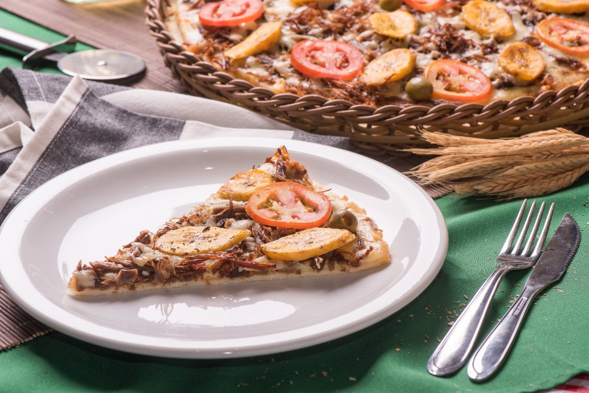 Molho de tomate, muçarela, carne de sol, tomate, banana da terra, azeitona verde e orégano.