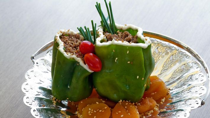 - Pegue os pimentões, coloque o recheio dentro preenchendo por completo.