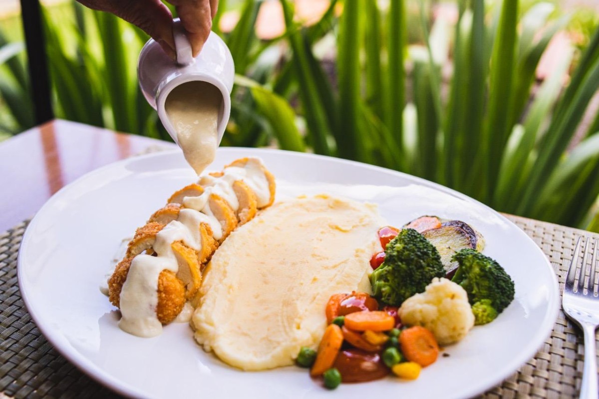 Filé de peito de frango recheado e empanado, delicioso molho quatro queijos, purê de batatas e legumes grelhados