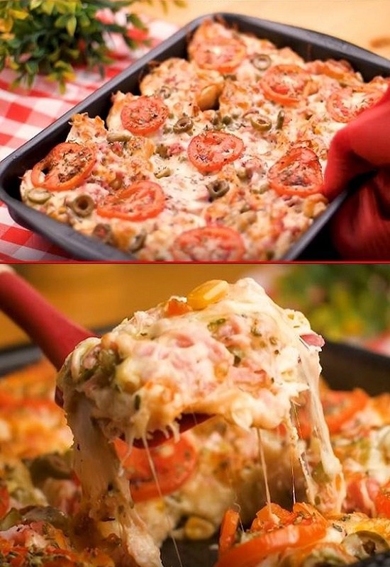 Faça uma camada de molho e torta, por cima decore com os tomates, a cebola e azeitonas.