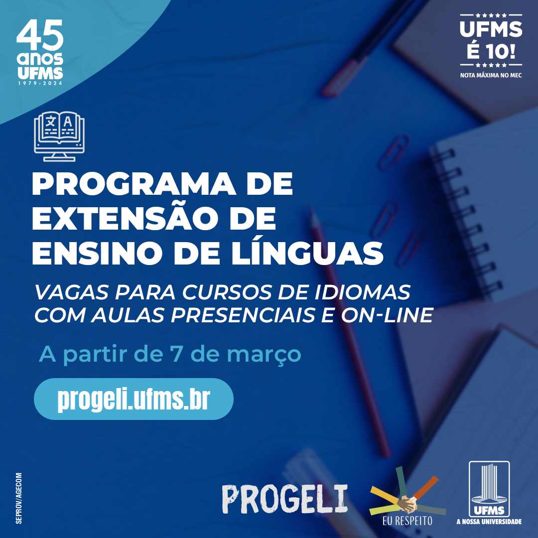 Interessados em aprender ou avançar nos estudos em uma língua podem se inscrever nos cursos presenciais e on-line oferecidos pelo Programa de Extensão de Ensino de Línguas (Progeli). Além de inglês, francês, espanhol, italiano, Língua Brasileira de Sinais (Libras), chinês e alemão, o projeto ainda oferece oficinas de tradução e curso gratuito de língua portuguesa para acolhimento de refugiados e imigrantes. As oportunidades são para pessoas a partir de 14 anos e as inscrições começam na quinta-feira, 7, às 8h, e podem ser feitas até o dia 21 de março pelo formulário.