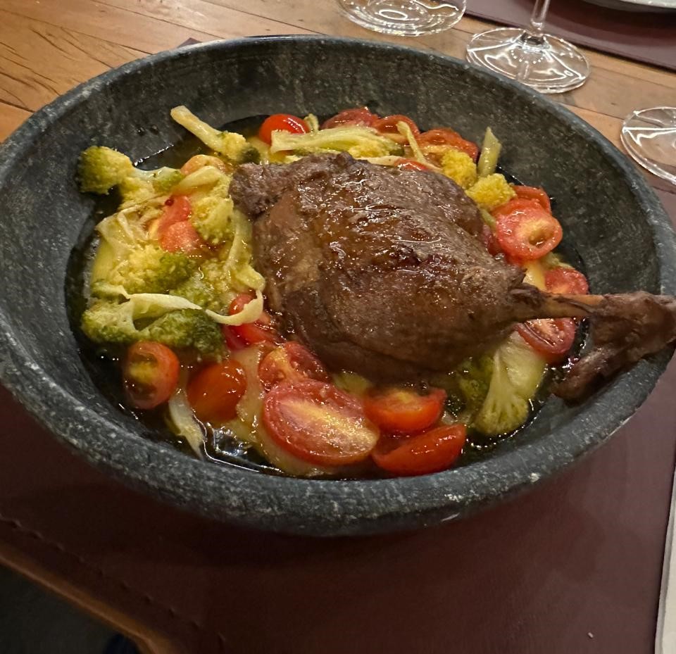 Confit de pato, acompanhado por um creme de mandioquinha, brócolis grelhados e finalizado com tomate cereja e alho frito.